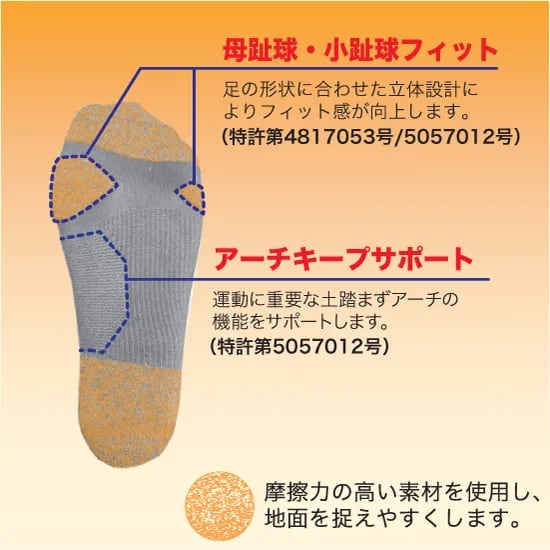 足首の角度を『Ⅴ』字形に近づけることで一般的なソックスと比較してかかとからの着地をスムーズにし、足首まわりの生地のズレやたるみによる不快感を軽減します。つま先の縫合部は凹凸の少ないフラットシームリンキング仕様。