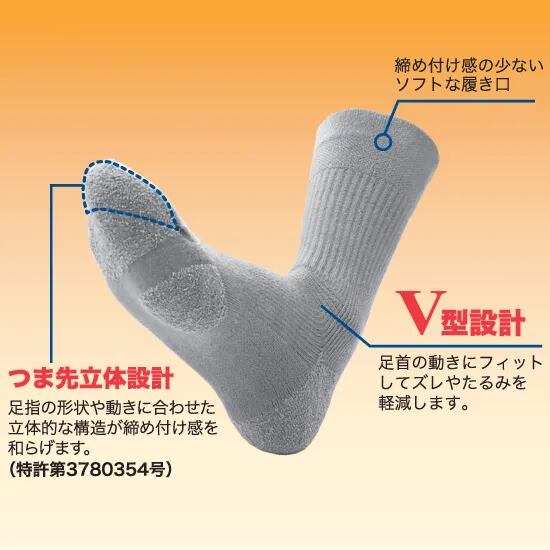 独自のⅤ型設計により、スムーズにかかとから一歩が踏み出せるウォーキングソックス。