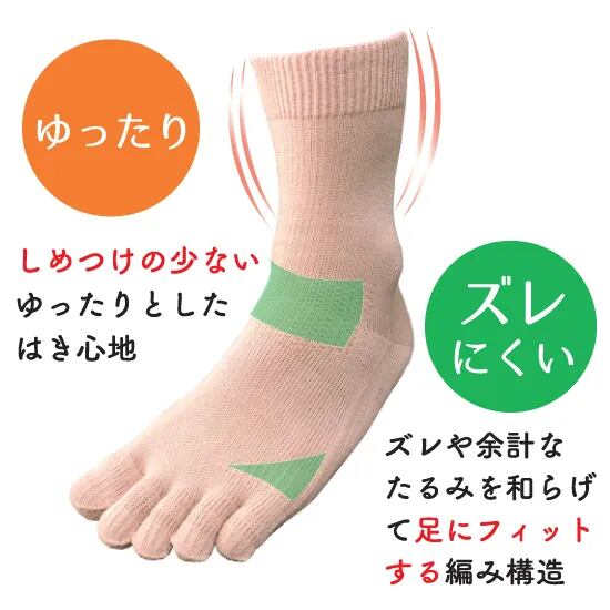 面倒な指入れがらくらくしやすい構造と丈夫さ、ゆったりとした履き心地なのにズレにくい快適性が両立。肌あたりの優しい無撚糸コットンを使用し、快適性を追求しました。