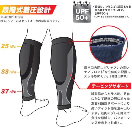 筋肉の形に沿った左右別設計のテーピング状サポートが優れたフィット感を生み出し、効果的に筋肉のブレを抑える段階式着圧設計のコンプレッションカーフスリーブ。